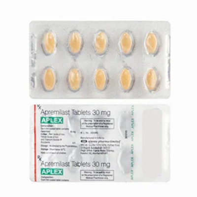 Aplex 30mg Tablet inhibits the activity of phosphodiesterase 4. It alleviates symptoms of psoriatic arthritis and psoriasis by preventing the function of chemical messengers that contribute to the inflammation that causes these illnesses.